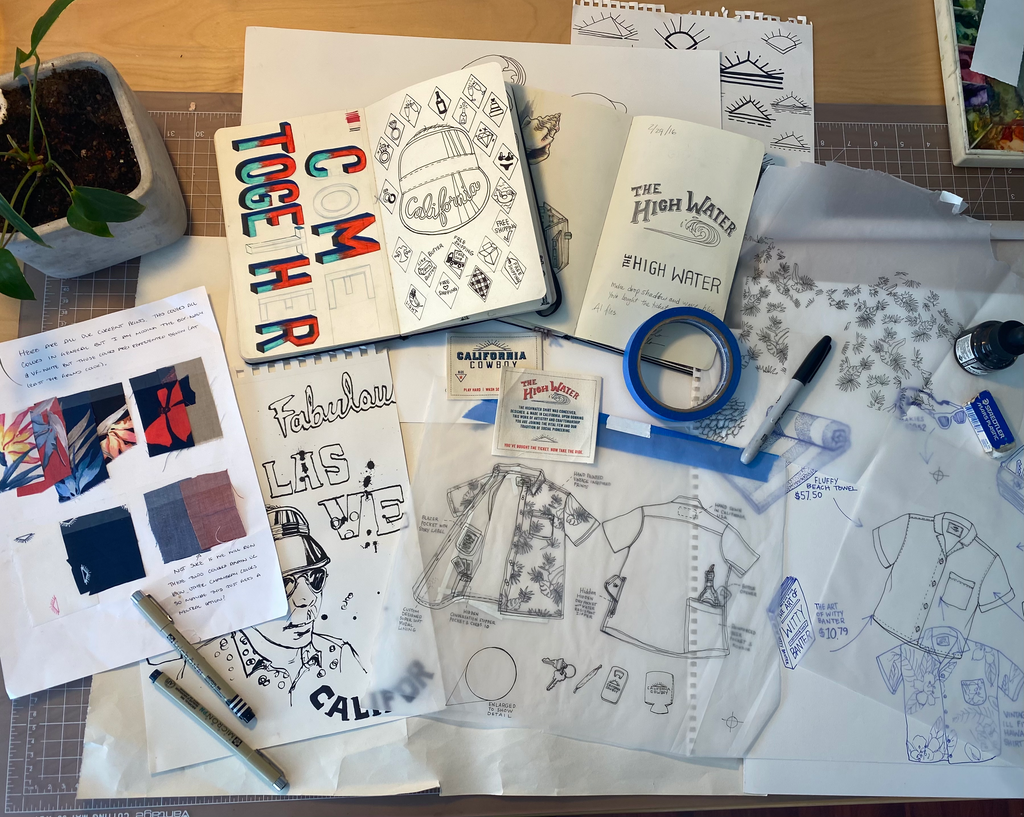 We draw pattern and color inspiration from places and people we love, movies we’ve watched on repeat, and cocktails we’ve indulged in far too many times. We also happen to have insanely talented designers, some of whom hand paint our prints that we transpose onto textiles. Bonus: Check out our Point Break-inspired “Sky-Dive on reclaimed redwood” in our shop in SF, hand painted by our graphic designer, Melissa.